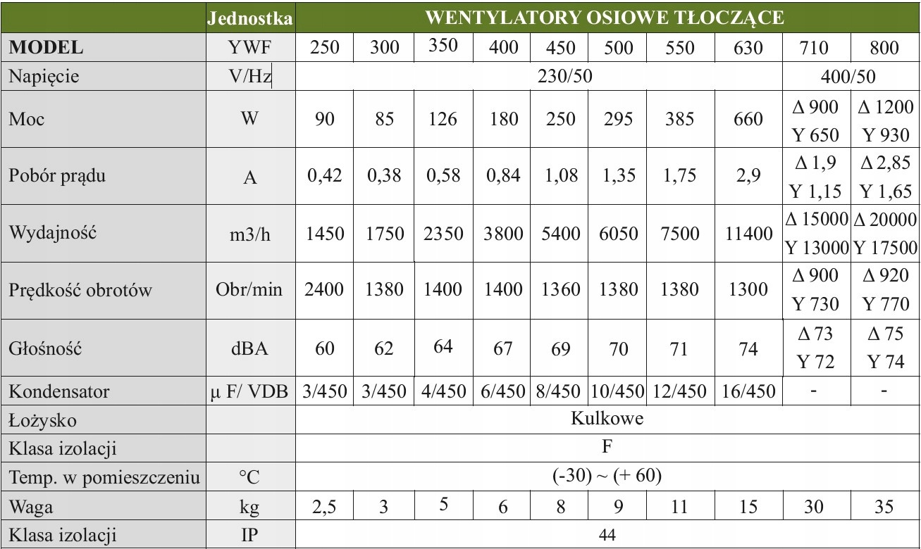 - Ventilatoarele YWF cu diametre de 250, 300, 350, 400, 450, 500, 550, 630 au motoare monofazate.