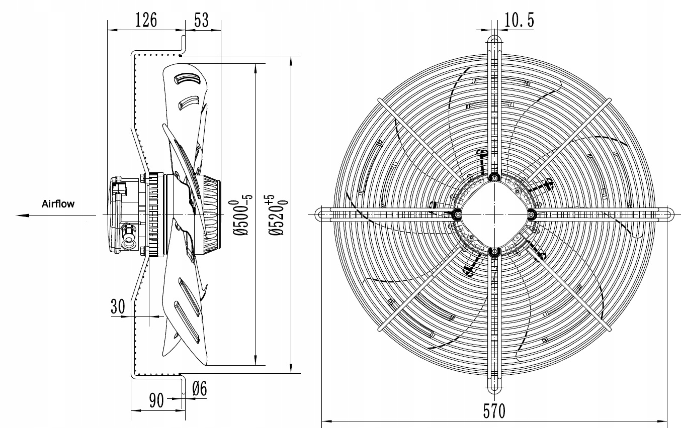 - Ventilatoarele YWF cu diametre de 250, 300, 350, 400, 450, 500, 550, 630 au motoare monofazate.