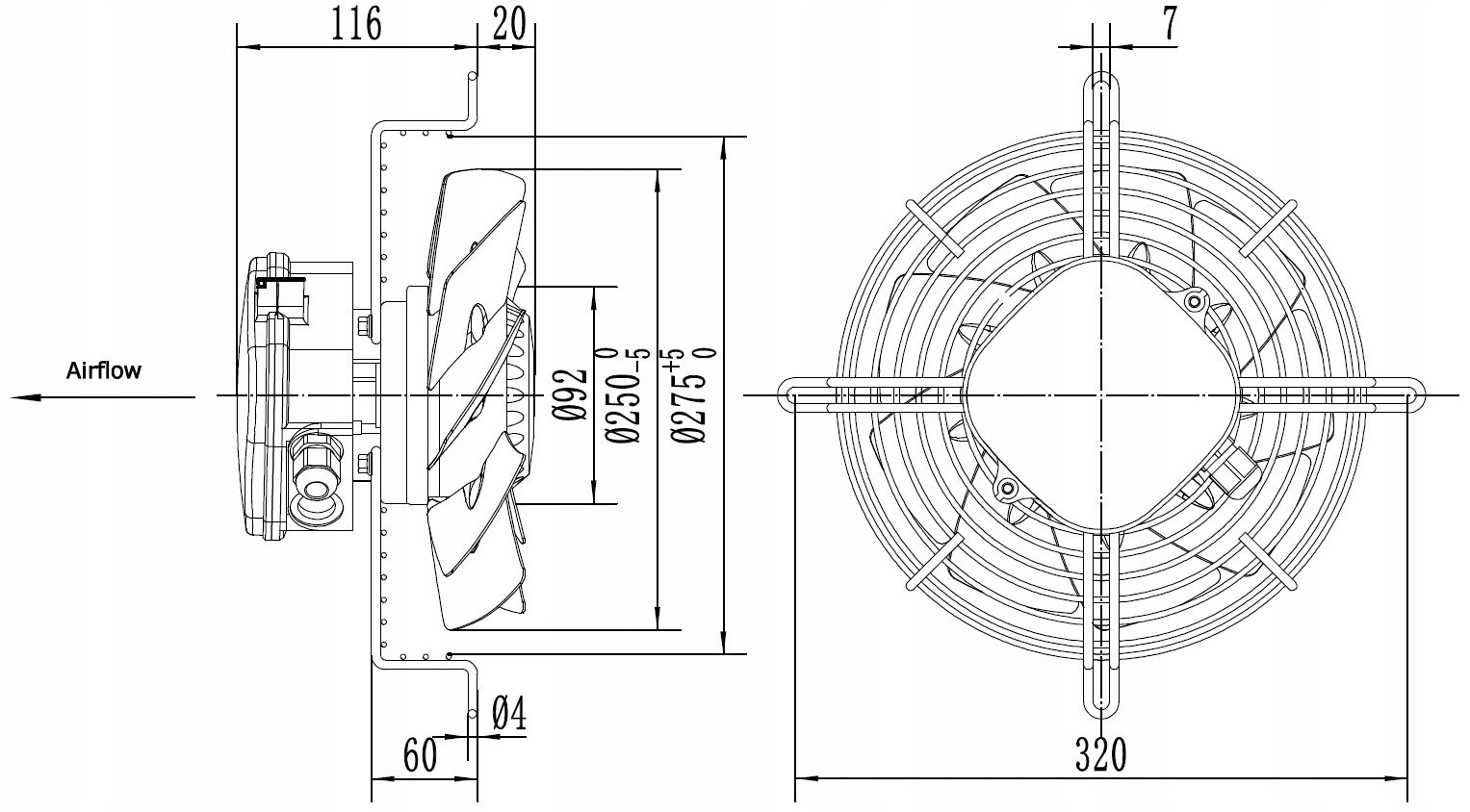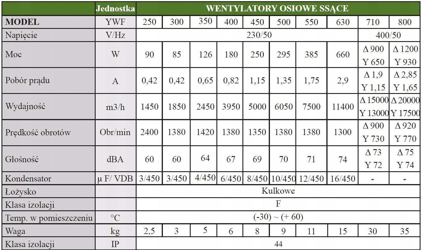 - Ventilatoarele YWF cu diametre de 250, 300, 350, 400, 450, 500, 550, 630 au motoare monofazate.