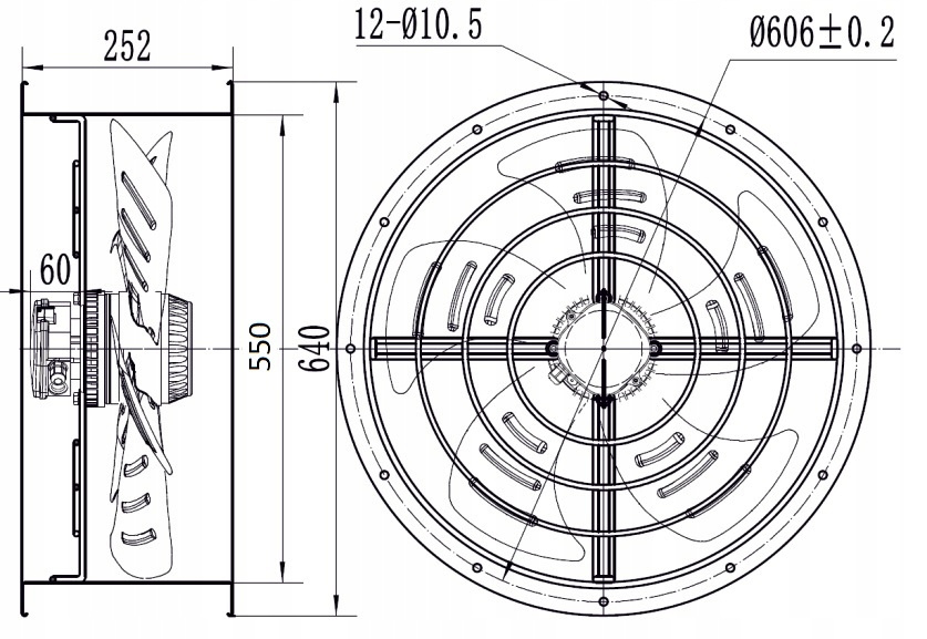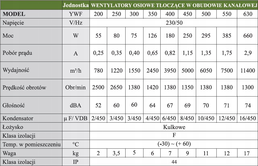 - Ventilatoarele YWF cu diametre de 200, 250, 300, 350, 400, 450, 500, 550, 630 au motoare monofazate.