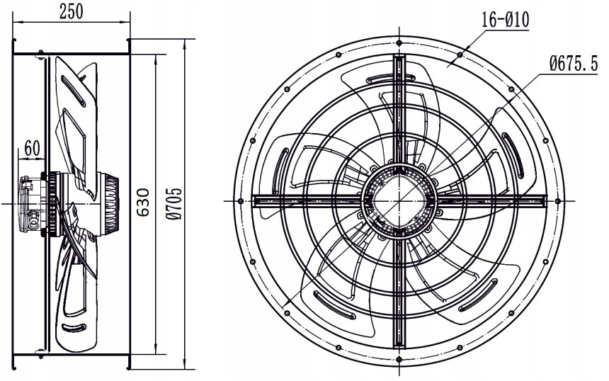 - Ventilatoarele YWF cu diametre de 200, 250, 300, 350, 400, 450, 500, 550, 630 au motoare monofazate.