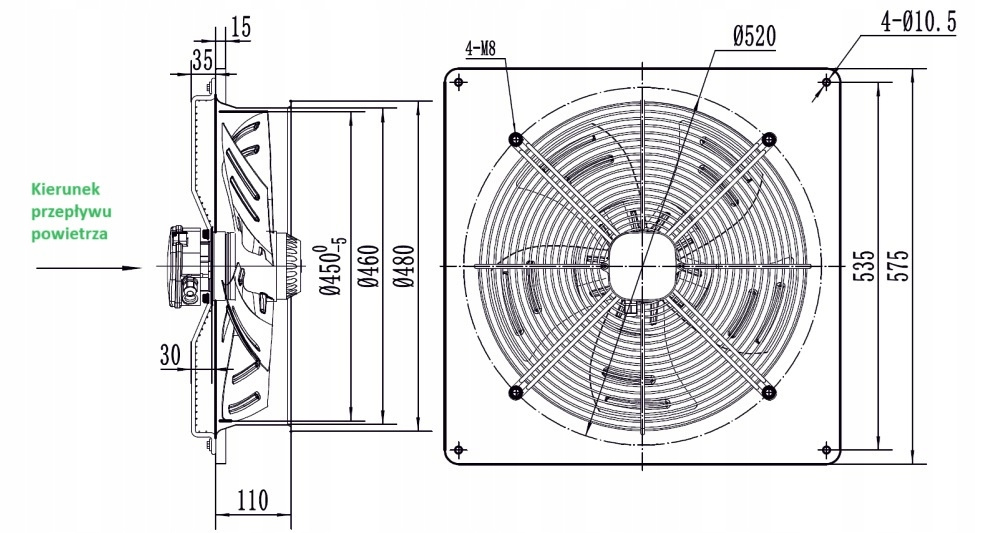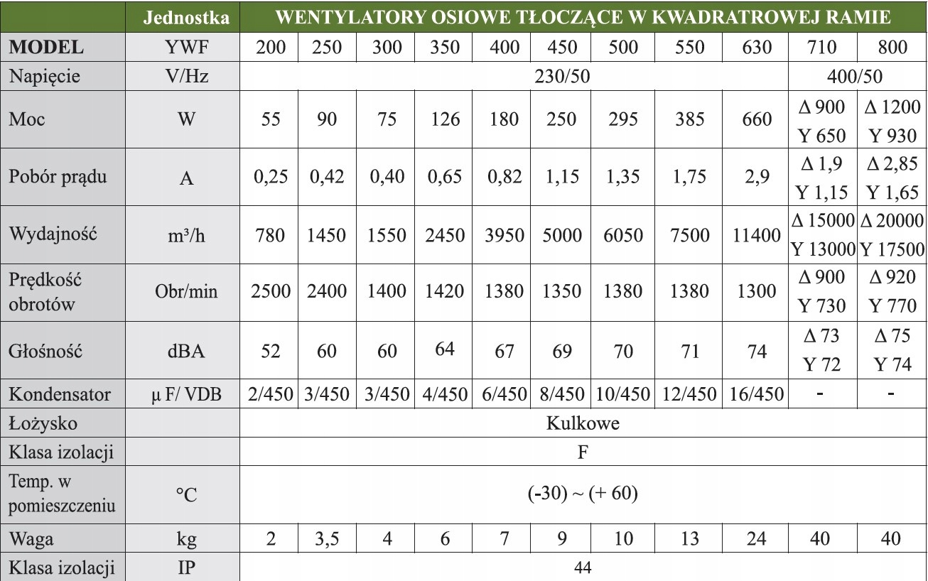 - Ventilatoarele YWF cu diametre de 200, 250, 300, 350, 400, 450, 500, 550, 630 au motoare monofazate.